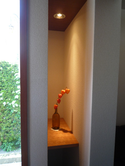 外壁は、杉のルーバーで覆い、玄関外部から内部にまで突き抜けたコンクリートの壁で内外や時空を繋ぐ。