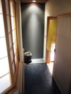 入口は茶室の内露地をイメージした空間で格子戸を開 けると”つくばい”があり、曲ったスロープと 障子から漏れる明り・モノトーンに統一された色
