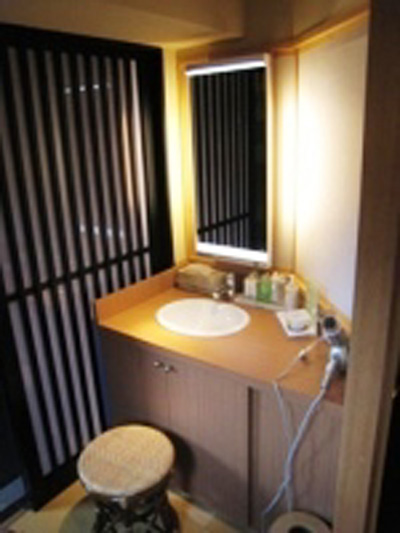 調が落着きと同時にその先への 期待感を煽る。その先に脱衣場兼洗面が、更に浴室へと続く。浴室は、穴の中にぐっとこもったよう な感覚を覚えるような天然スレート石を壁と黒